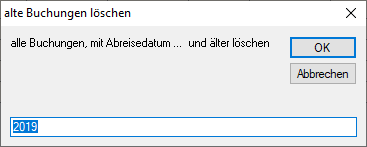 Wählen Sie dort „alte Buchungen löschen“ aus. Es erscheint ein Dialog, bei dem Sie das Jahr eingeben können bis zu dem alle Buchungen gelöscht werden: ![]() | |